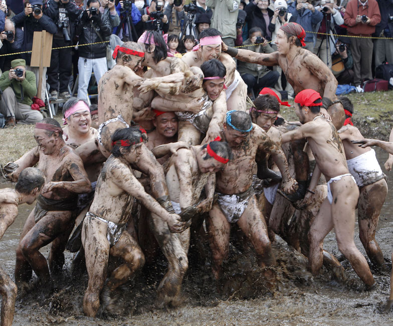 2月25日,在日本千叶县四街道市郊外的稻田里,居民们参加一年一度的“泥浆节”。当地的男子们赤身跳进稻田,把泥浆涂抹在身上。人们希望通过这种仪式祈求新的一年能有个好收成。