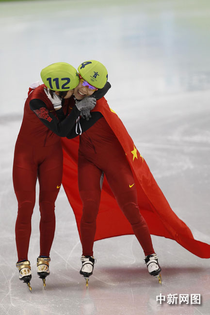 北京时间27日中午,中国选手王濛在2010年温哥华冬奥会短道速滑女子1000米的决赛中摘得金牌,至此,中国短道速滑女队包揽了本届冬奥会女子全部四个项目的金牌创造了历史。中新社记者 盛佳鹏摄