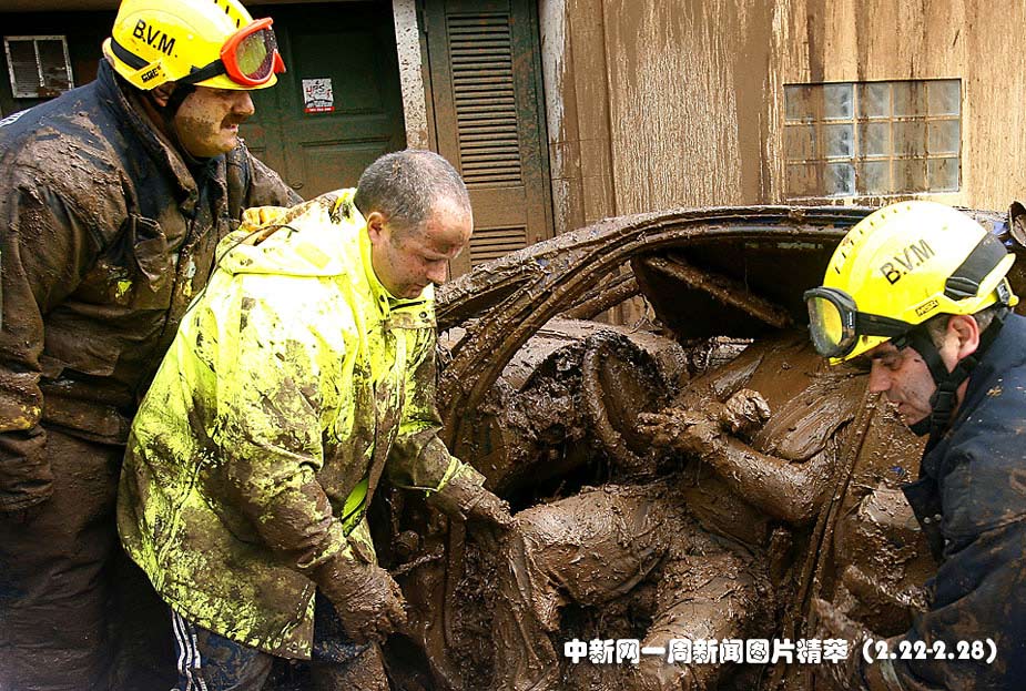 22日(周一),在葡萄牙马德拉岛丰沙尔市,救援人员在移出车厢内的遇难者遗体。当地政府表示,由洪灾引发的泥石流导致42人死亡,32人失踪。