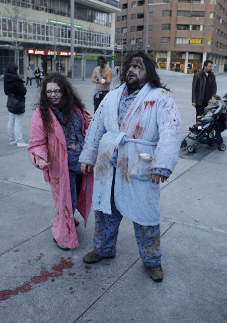 当地时间2月27日,在西班牙马德里,众多爱好者装扮成“僵尸”的模样,在街头举行巡游活动。图片来源:中国新闻网
