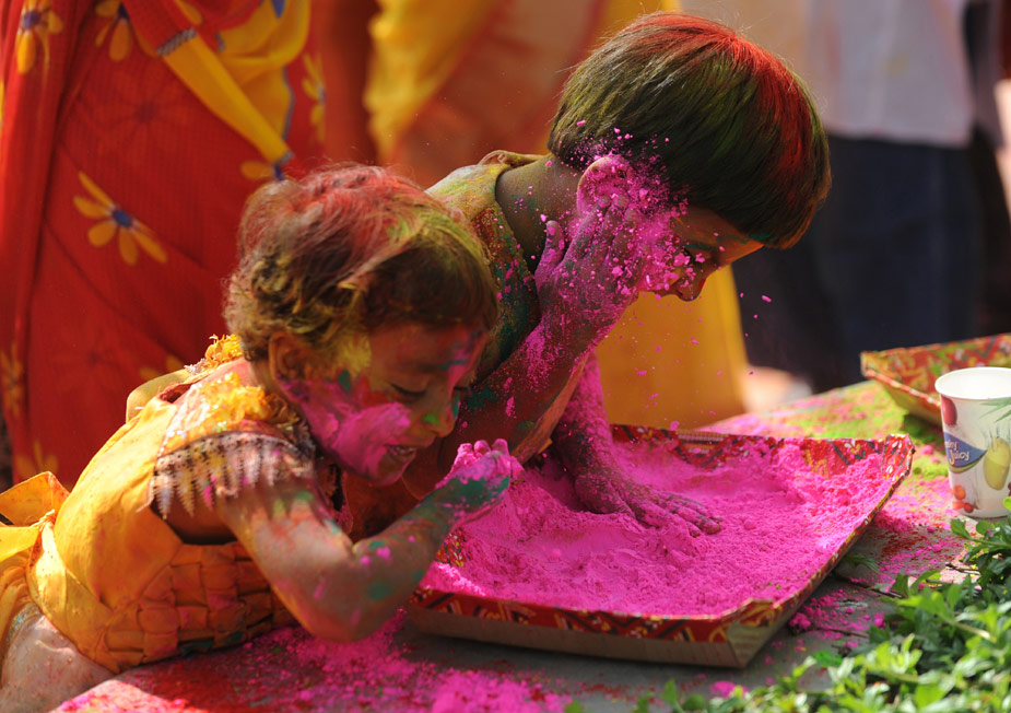 2月28日,印度举行庆祝洒红节活动,人们互撒颜料以示祝福。 洒红节是印度最盛大的节日之一,在每年2月至3月间举行。按照传统习俗,人们会在自己的脸上和身上涂抹颜料,还向别人身上抛撒彩色颜料和粉末。