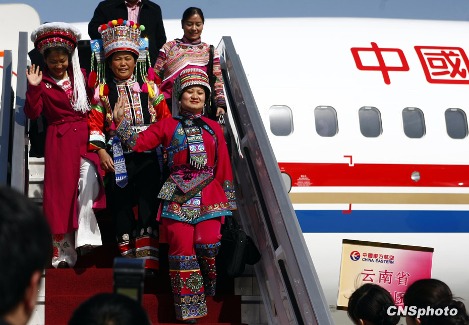 3月2日,参加全国两会的代表、委员陆续抵达北京。图为云南代表团的少数民族代表盛装抵京。中新社发 杜洋 摄