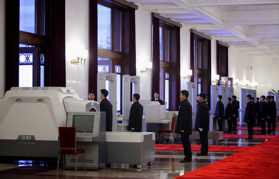3日下午,全国政协十一届三次会议将在北京人民大会堂开幕,2010年全国“两会”由此正式揭开大幕,目前各项工作准备就绪。图为人民大会堂的主要入口处的安保人员。Feng Li 摄