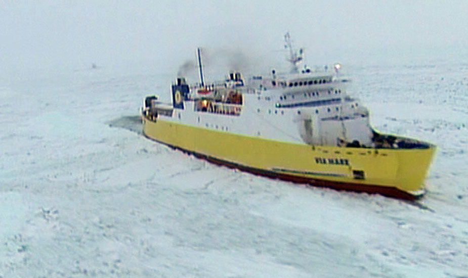 3月4日,瑞典海事部门官员表示,一艘客轮和数艘货船由于海面结冰,被困在接近瑞典东部海岸的波罗的海中,共有近千人被困。图片来源:中国新闻网
