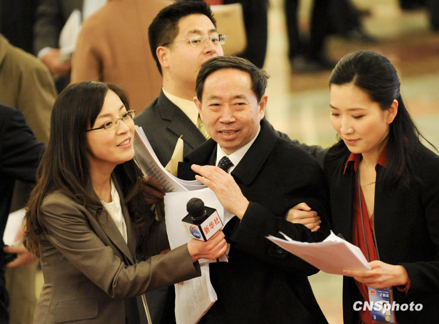 3月5日上午9时,十一届全国人大三次会议在北京隆重开幕。国务院总理温家宝作政府工作报告。图为教育部长袁贵仁进场时受到记者争相采访。中新社发 廖攀 摄