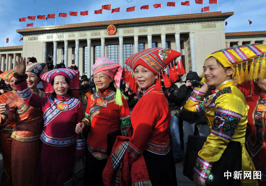 十一届全国人大三次会议3月5日在北京开幕,各民族人大女代表的服饰靓丽多彩,在天安门广场前大展英姿。 中新社记者 贾国荣 摄