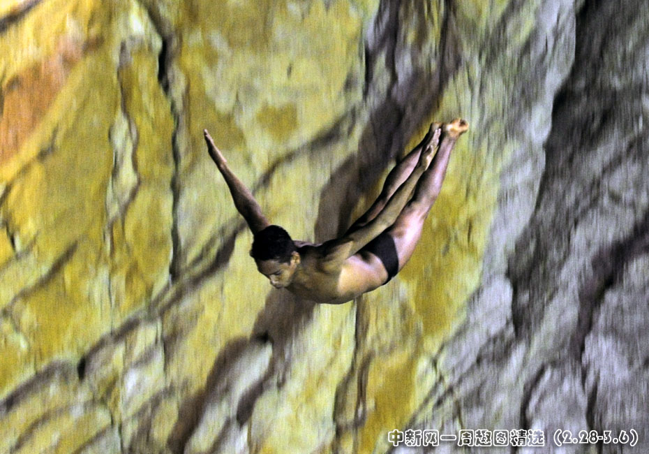 3月1日,墨西哥一名悬崖跳水爱好者手持火把,在该国南部城市阿卡普尔科的“拉·奎布拉达”悬崖上跳水。此种传统可追溯至1934年。当时,住在阿卡普尔科市的两位邻居相互“挑战”,通过从悬崖上跳向海中来比试各自的勇气和力量。图片来源:中国新闻网>>点击观看详细内容
