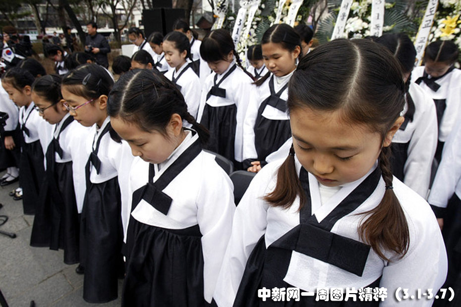 近日,韩国首尔的小学生身穿传统服饰在三一运动纪念活动上默祷。三一运动纪念日是为了纪念1919年3月1日发生的反抗日本殖民统治的起义而设。图片来源:中国新闻网