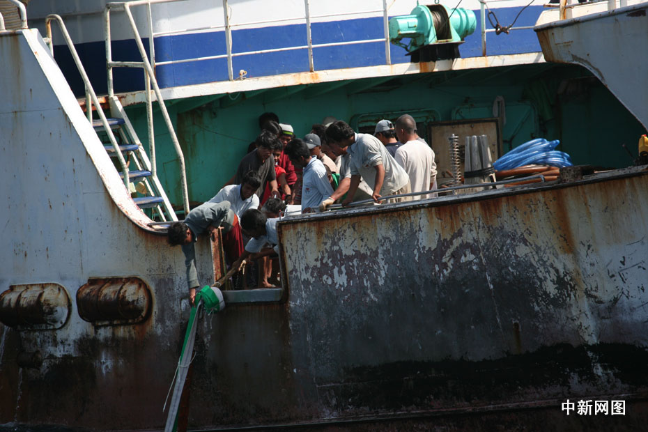 09年4月在西印度洋遭索马里海盗挟持的台湾远洋渔船“稳发161号”,历经各方营救,终于在遭挟持10个多月后,包括船长颜胜男等共28人返回高雄港。图片来源:中国新闻网