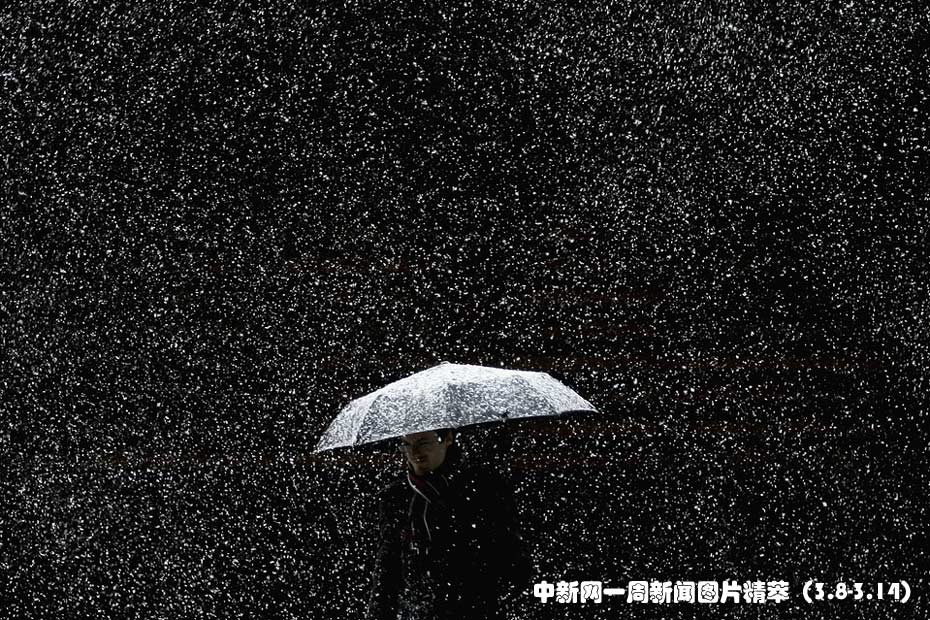 周一,一名男子打着雨伞走在下着大雪的西班牙巴塞罗那街头。图片来源:中国新闻网