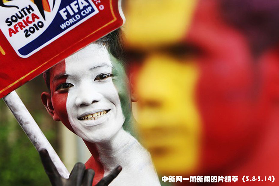 周一在印尼雅加达举行的FIFA世界杯足球赛宣传活动上,人们在身上涂上了参赛国家的国旗。图片来源:中国新闻网