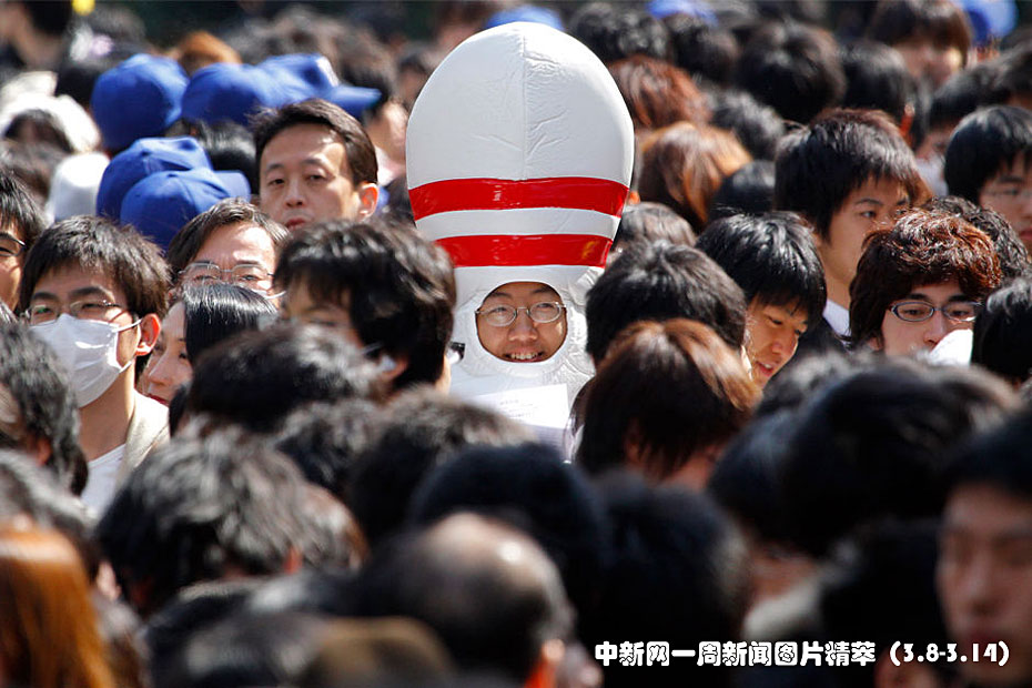 周三,日本东京大学校园里,一名学生装扮成保龄球瓶的样子。当天,这所日本最富盛名的大学放榜,众多考生前往查榜。图片来源:中国新闻网