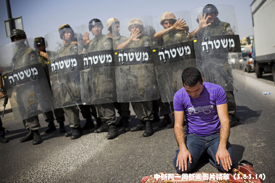 周五,一名巴勒斯坦人在耶路撒冷附近的老城做祈祷,他的身后是以色列军警组成的人墙。图片来源:中国新闻网