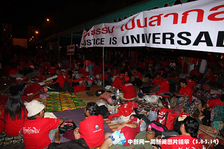 周六,泰国“红衫军”陆续从泰国北部、东北部等外府进入曼谷市,在集会主会场幸福桥和五马路路段搭设演讲舞台和帐篷,拉开大规模示威序幕。图片来源:中国新闻网