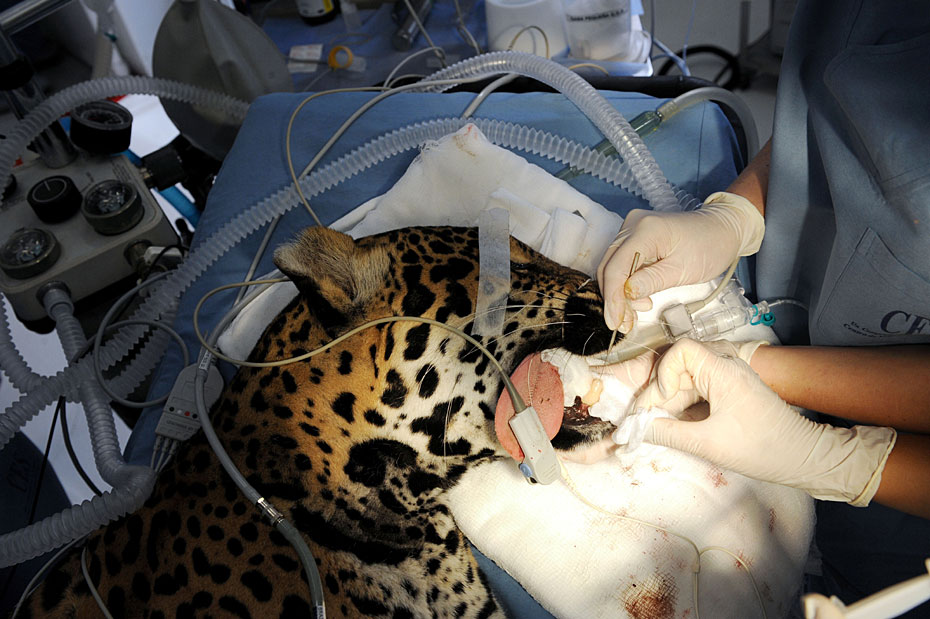 3月13日,在哥伦比亚麦德林附近的一个兽医诊所,一只雌性美洲虎在接受牙齿手术。图片来源:中国新闻网