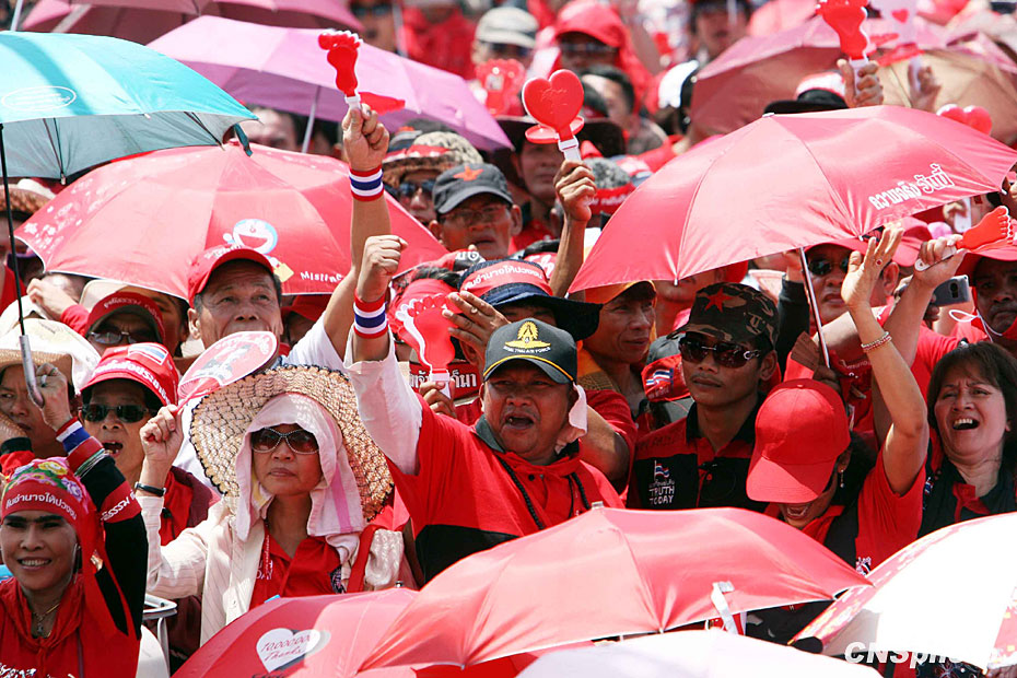 3月13日起,泰国“红衫军”陆续从泰国北部、东北部等外府进入曼谷市,在集会主会场搭设演讲舞台和帐篷,拉开大规模示威序幕。图片来源:中国新闻网