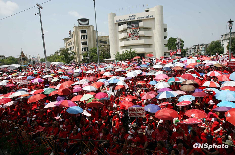 3月13日起,泰国“红衫军”陆续从泰国北部、东北部等外府进入曼谷市,在集会主会场搭设演讲舞台和帐篷,拉开大规模示威序幕。图片来源:中国新闻网