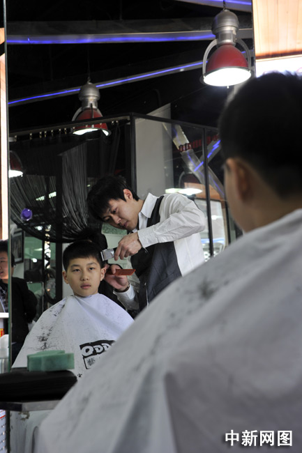 3月17日,北京,一个小朋友在一家美发店理发。中新网记者 金硕 摄