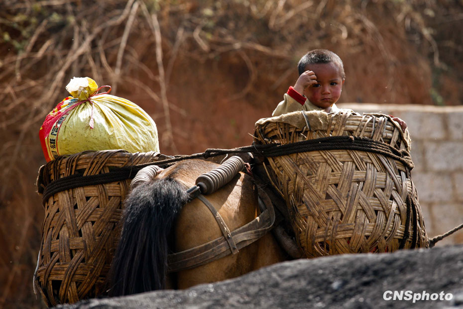 据云南省气象部门评定,全省综合气象干旱重现期为80年以上一遇,其中滇中、滇东、滇西东部的大部地区为百年以上一遇。图为随家人外出运水的儿童。中新社发 刘冉阳 摄