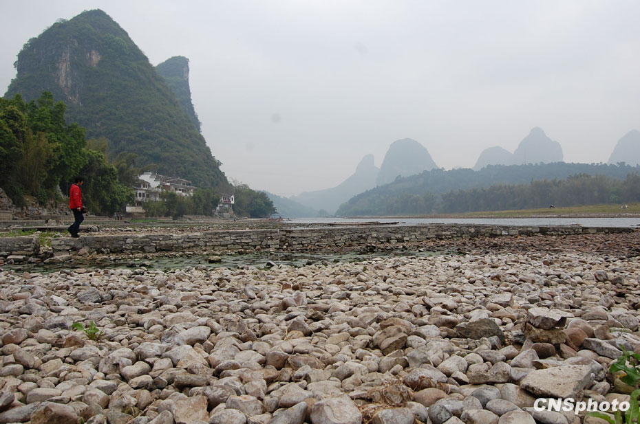 3月17日,受广西50年不遇旱情影响,漓江水位持续下降,漓江游览航线缩短。图为阳朔码头露出河床的漓江。中新社发 诸葛保满 摄