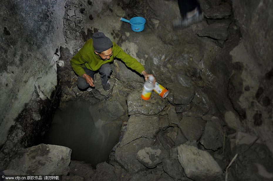 3月18日,贵州省息烽县流长乡新中村村民在从没有干得如此严重的深井里取水。 吴东俊/CFP