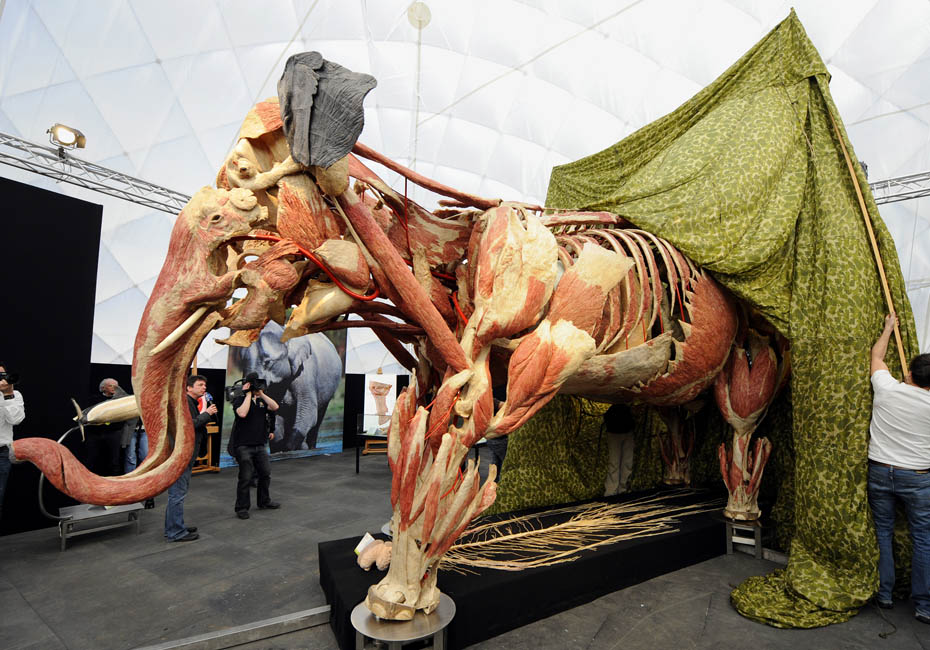 德国著名解剖学家巩特尔·冯·哈根斯博士被称为“死亡先生”,目前展出的是有史以来的最大的动物尸体。体型巨大的“桑芭”尸体高3.5米,重3.2吨。据悉“桑芭”将于2010年4月归还诺因基兴动物园。图片来源:中国新闻网