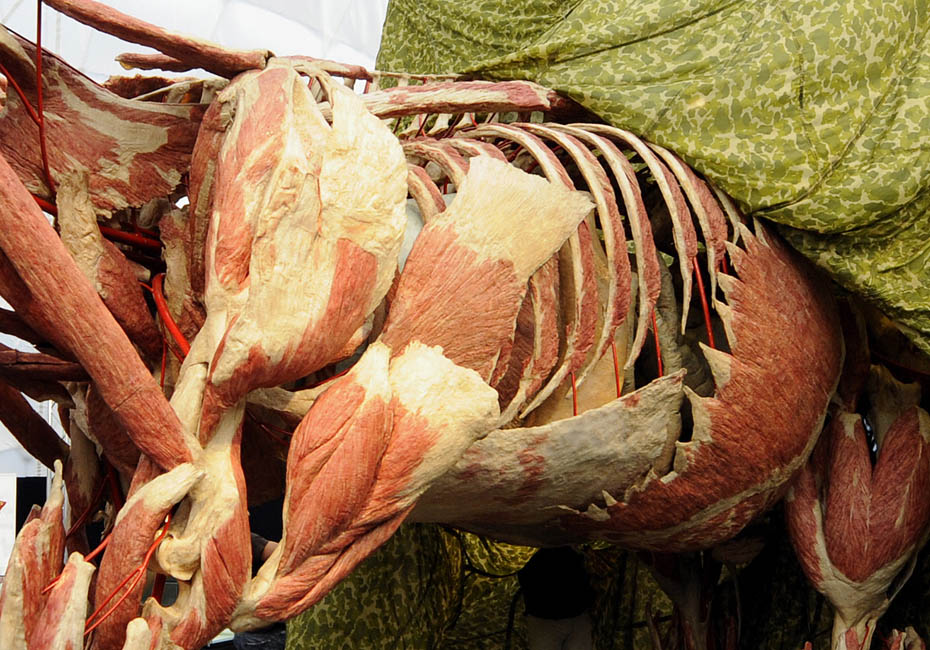 德国著名解剖学家巩特尔·冯·哈根斯博士被称为“死亡先生”,目前展出的是有史以来的最大的动物尸体。体型巨大的“桑芭”尸体高3.5米,重3.2吨。据悉“桑芭”将于2010年4月归还诺因基兴动物园。图片来源:中国新闻网