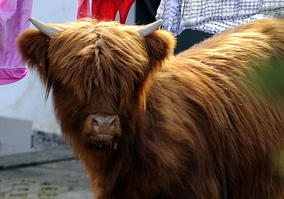 3月18日,德国一头苏格兰高地牛来到一居民院内懒洋洋的晒太阳,最后经过兽医的麻醉和消防员协力才将这头蛮力十足的家伙“制服”。图片来源:中国新闻网