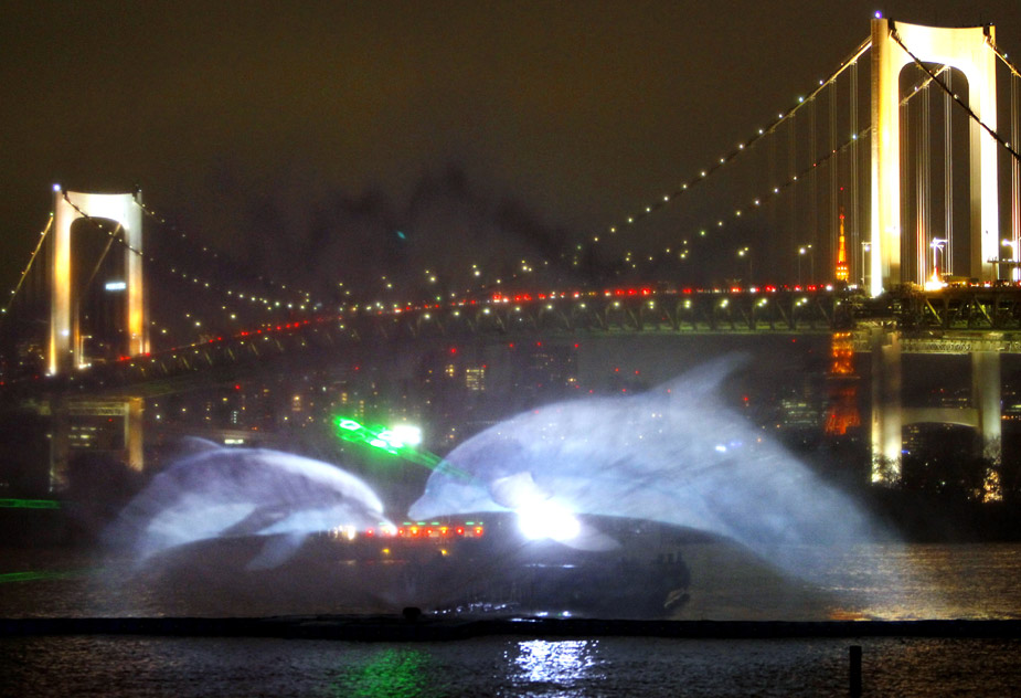 3月19日晚,在日本东京湾上演了一场美轮美奂的“海上幻灯”。东京湾的喷泉喷射出长60米、高23米的各种海洋生物的画面,令人惊叹。