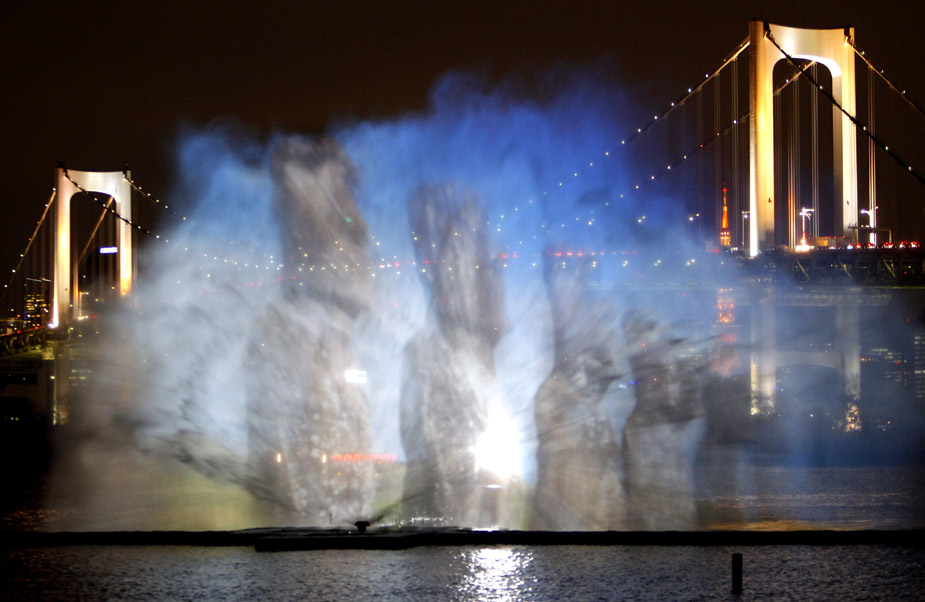 3月19日晚,在日本东京湾上演了一场美轮美奂的“海上幻灯”。东京湾的喷泉喷射出长60米、高23米的各种海洋生物的画面,令人惊叹。