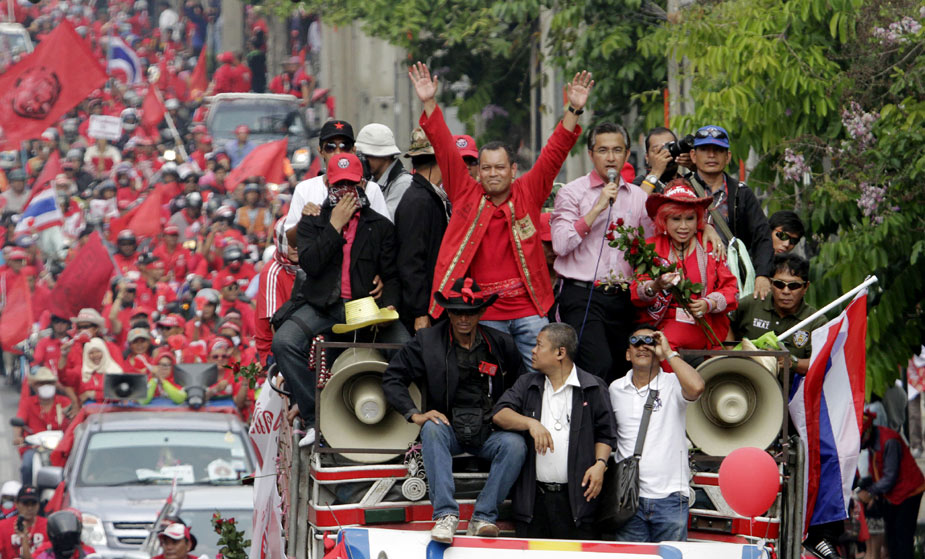 泰国红衫军20日号召数千辆汽车上街,在曼谷大游行,路线总长约45公里,横跨曼谷多条主要街道,势要瘫痪曼谷。图片来源:中国新闻网