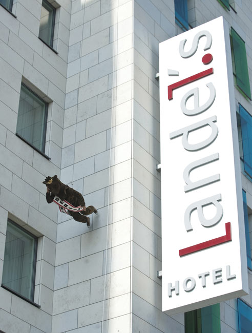 3月18日,在德国柏林举行的“高楼漫步”活动中,一名女子打扮成熊的模样(柏林的象征)在天使酒店外墙上行走,参加活动的人都有绳索保护。