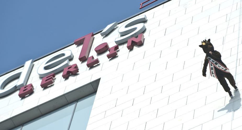 3月18日,在德国柏林举行的“高楼漫步”活动中,一名女子打扮成熊的模样(柏林的象征)在天使酒店外墙上行走,参加活动的人都有绳索保护。