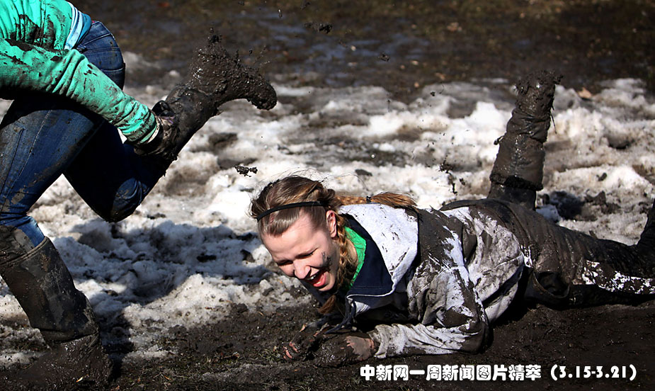 17日(周三), 在美国北达科他州举行的一场女子泥潭摔跤比赛中,胜利的一方露出笑容。