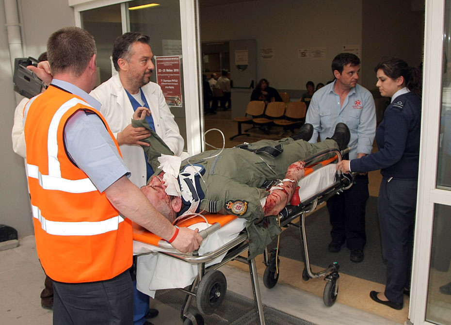 图为英国“红箭”特技飞行队伤员抵达医院接受治疗。