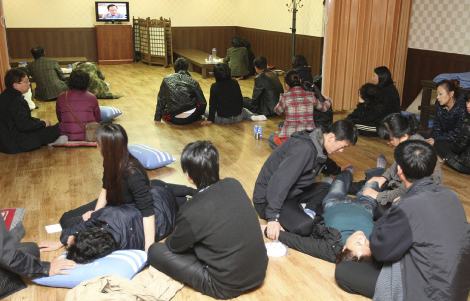 首尔当地时间26日晚9点45分许,在韩国西部海域执行警戒任务的天安舰(1200吨级)因不明原因事故,船底被炸开洞,船尾开始下沉。天安舰上共有104人,韩国巡逻艇和直升飞机迅速展开救援行动,事发5小时后,官员称已救出58人,但因为强风和夜幕,救援行动进展缓慢,其它人员仍下落不明。图为韩国海军“天安舰”上士兵的家属正围在电视前等待消息。