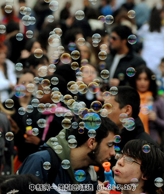 3月21日,在意大利罗马城中的波波洛广场,参加“快闪”族聚会的人们吹泡泡迎接春天的到来。图片来源:中国新闻网>>点击观看详细内容