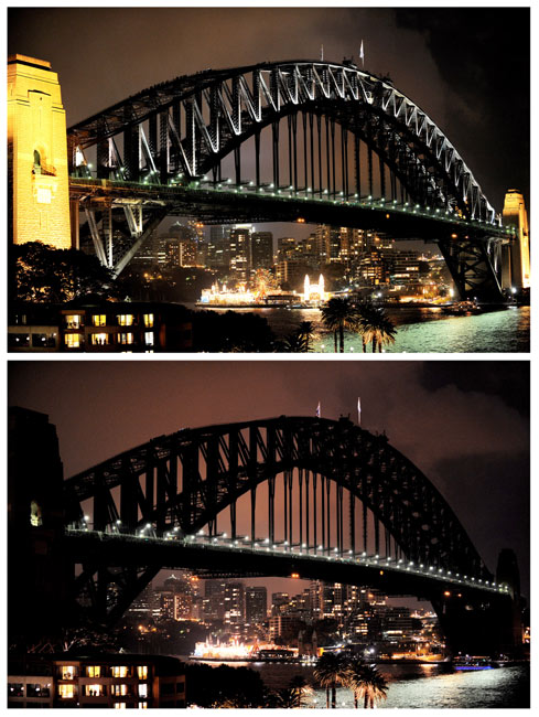 由世界自然基金会发起的“地球一小时”环保活动27日20点30分按照时区依次在全球数千个城市展开。图为澳大利亚悉尼港大桥在熄灯前和熄灯后的景色。