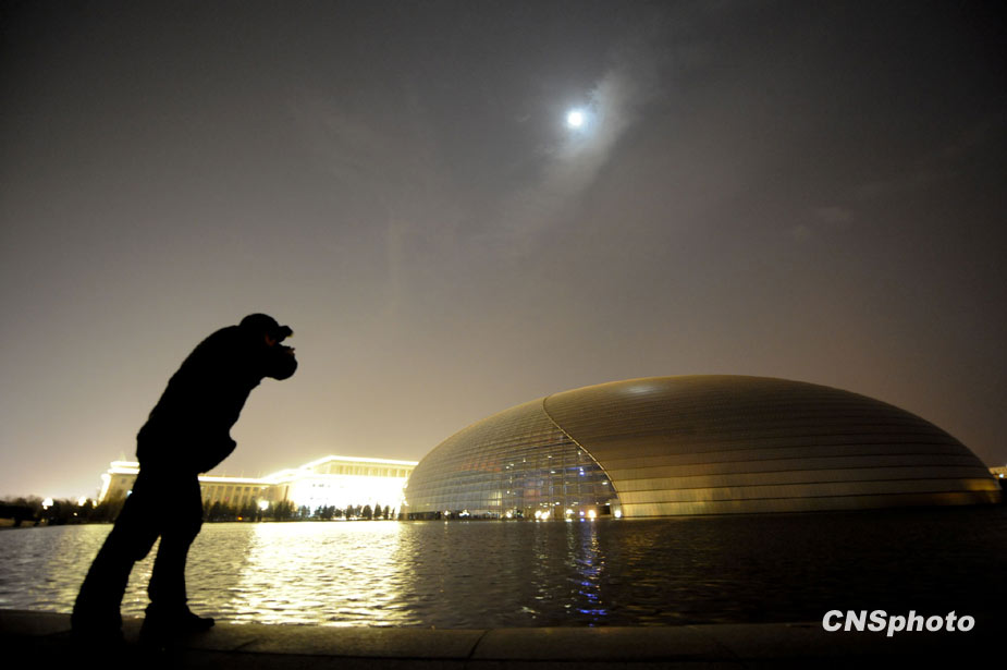 3月27日20点30分,北京国家大剧院关闭外景灯光,参与全球“关灯一小时”活动。图为记者关注熄灯后的国家大剧院。中新社发 廖攀 摄