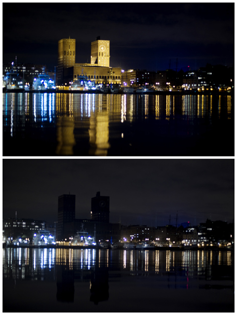 由世界自然基金会发起的“地球一小时”环保活动27日20点30分按照时区依次在全球数千个城市展开。图为挪威奥斯陆市政厅在熄灯前和熄灯后的景色。