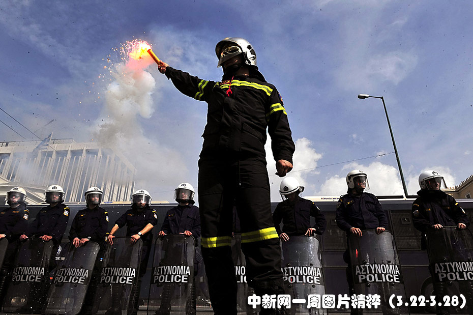 3月23日,在希腊雅典,警察封锁了希腊国会的入口,一名抗议示威的消防队员在一旁点燃了手中的燃烧棒。希腊政府表示,希望能在即将召开的欧盟首脑峰会上解决希腊的债务问题。