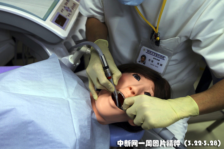 3月23日(周二),东京昭和大学一名牙医正在一个名为花子的机器人身上演示治疗操作。这个机器人是该校自主开发的,她的嘴会流血,也会分泌唾液。