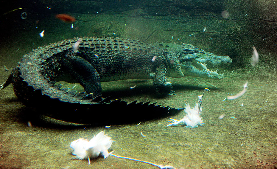 3月29日,澳大利亚悉尼野生动物园的一条鳄鱼雷克斯正在享受它的美味——鸡肉。图片来源:中国新闻网