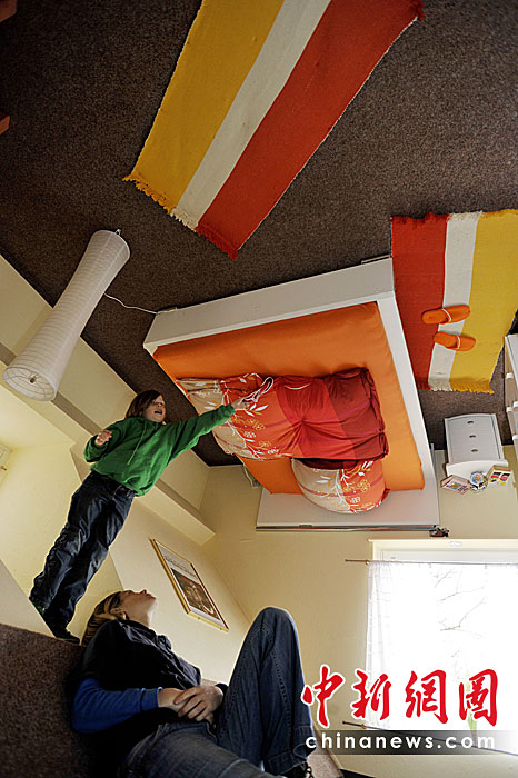 3月30日,德国盖托夫市“疯狂的房子”面向公众开放。该房屋整个颠倒里面的家具也是被钉在屋顶上的。图片来源:中国新闻网