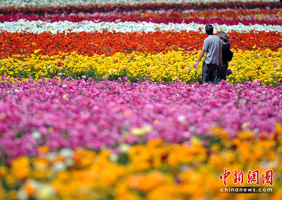 美国加利福尼亚州圣迭戈的卡尔斯巴德花田近日繁花盛开,姹紫嫣红的花朵整齐地铺满在五十英亩的土地上,一望无垠的花海,美不胜收。图片来源:中国新闻网