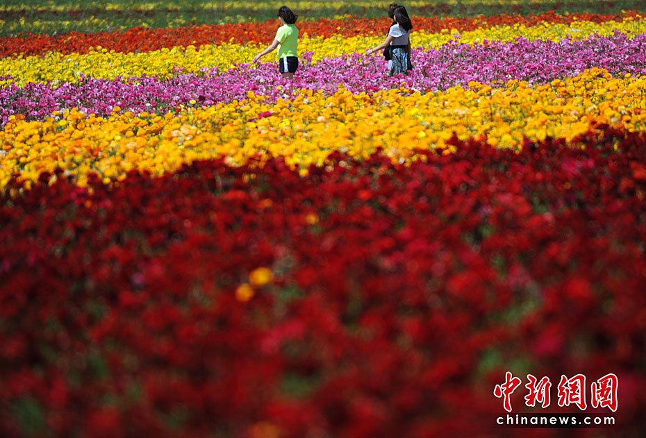 美国加利福尼亚州圣迭戈的卡尔斯巴德花田近日繁花盛开,姹紫嫣红的花朵整齐地铺满在五十英亩的土地上,一望无垠的花海,美不胜收。图片来源:中国新闻网