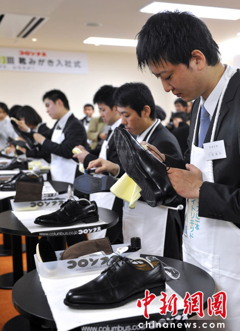 4月1日,日本一家鞋油厂新员工在入职仪式上为老员工擦鞋。图片来源:中国新闻网