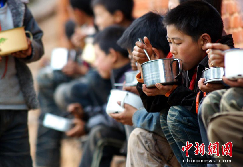 孩子们吃饭时都不喝水喝汤,干旱已让他们适应了这样的生活。沙浪 摄