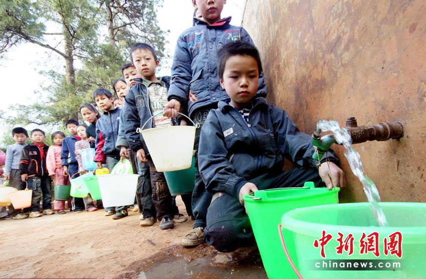 送水车将水送入水窑,晚饭后是孩子们排队取水的时间。沙浪 摄(CFP)