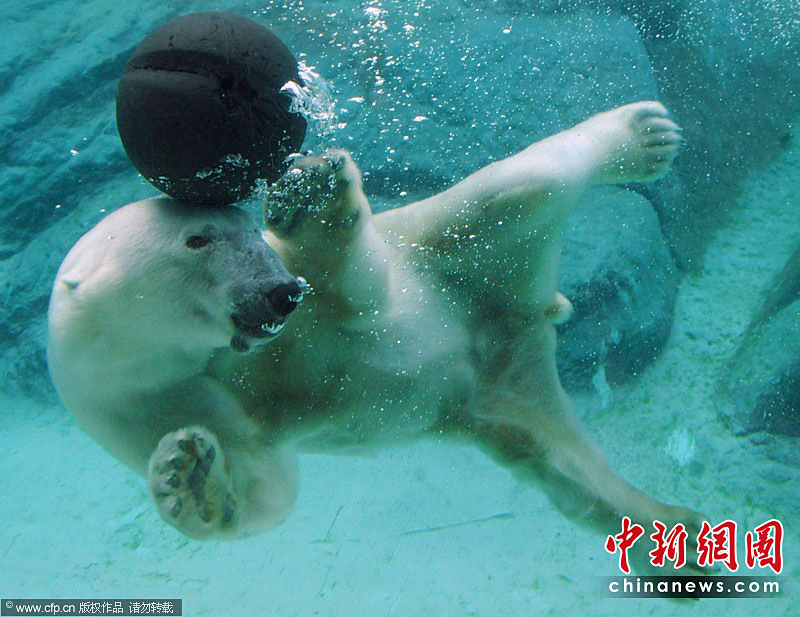 美国Asheboro北卡罗来纳动物园一头名叫威利的北极熊可是个“活宝”。任何一个可用的东西都能成为它在镜头前“耍宝”的玩具。图片来源:CFP